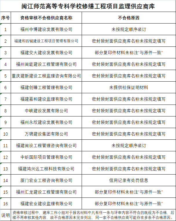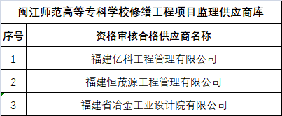 闽江师范高等专科学校修缮工程项目监理供应商库资格审核结果公告