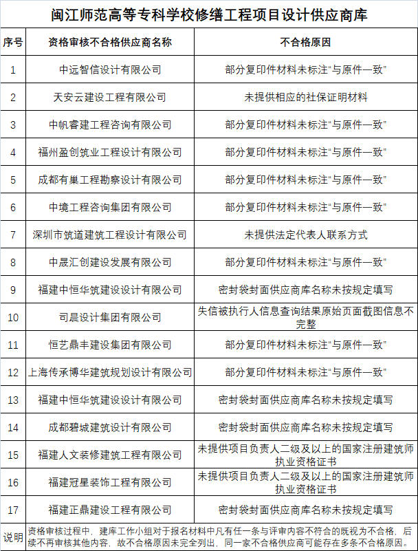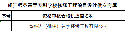 闽江师范高等专科学校修缮工程项目设计供应商库资格审核结果公告