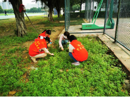 活动中,志愿者们身穿熟悉的红马甲,充分发扬不怕脏、不怕累的精神,清理校园篮球场旁的杂草,弯腰、下蹲、起身,志愿者们辛勤拔草的身影,构成了校园里一道靓丽的风景线。