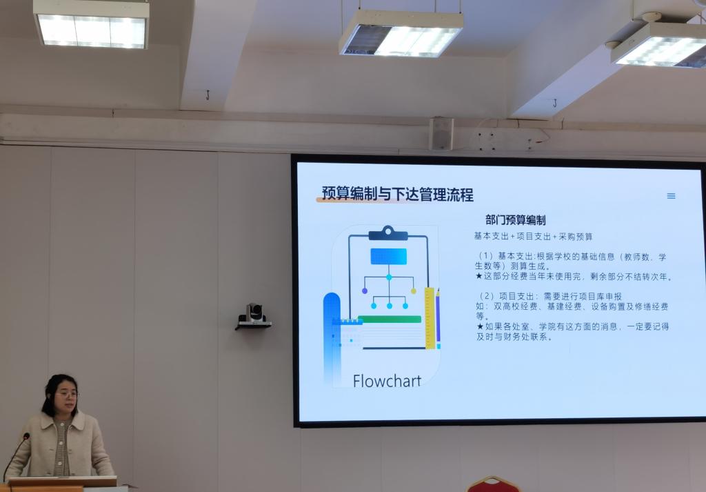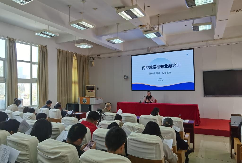 为深入学习贯彻习近平新时代中国特色社会主义思想及党的二十大和二十届二中、三中全会精神,巩固深化党纪学习教育成果,进一步加强内控体系建设,提升内控工作水平,财务处联合资产管理处、后勤保卫处、党政办等职能部门举办内控建设专题系列培训会。3月19日下午,开展了第一期内控建设专题业务培训,主要聚焦预算业务和收支业务两大核心模块。会议由财务处处长庄翠冷主持,部门及学院相关负责人、报账人员等60多人参加了此次培训。