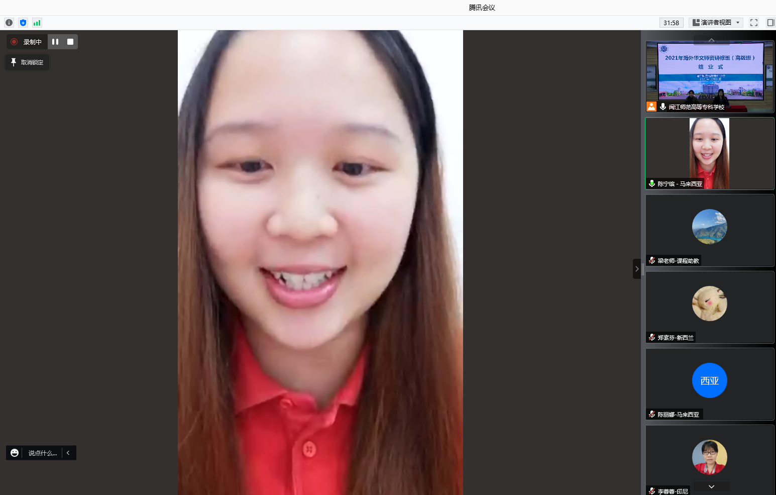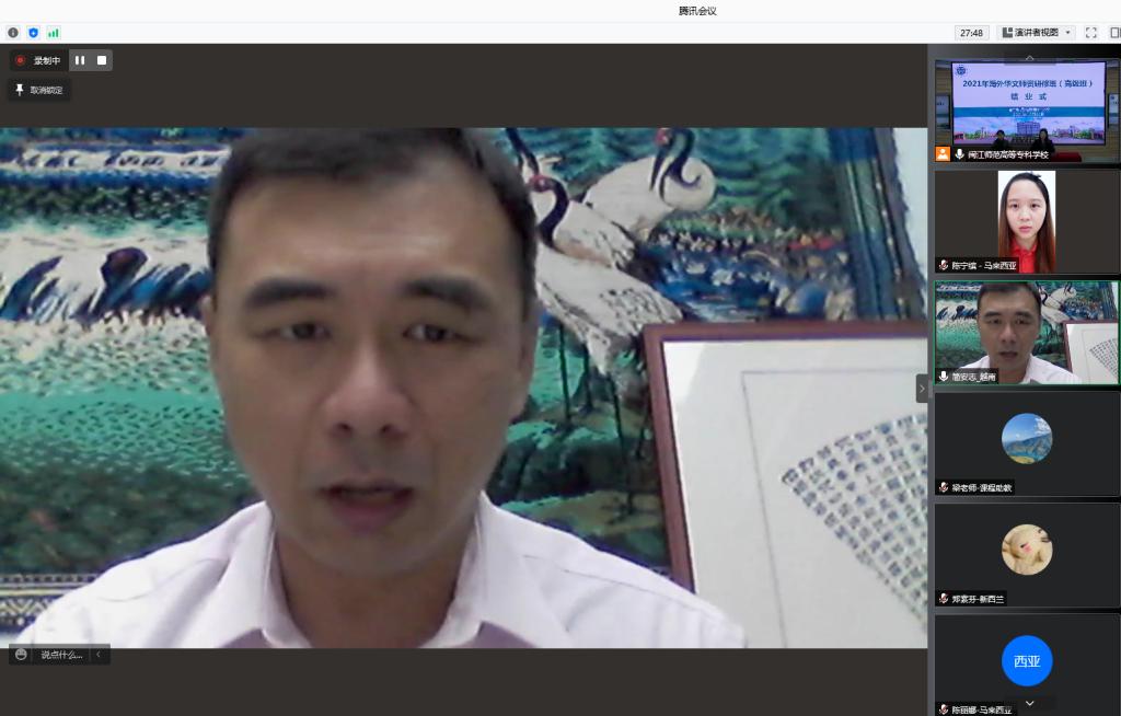 12月31日,2021年海外华文师资研修班(高级班)圆满结束。本次研修班由福建省侨联主办,福州市侨联和闽江师范高等专科学校承办。来自马来西亚、印度尼西亚、菲律宾、越南、新西兰、澳大利亚等国家的75位海外华文教师齐聚云端,共同参加为期23天的集中研修学习。