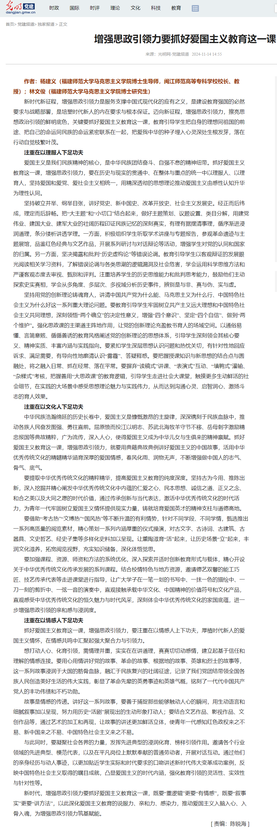 爱国主义是我们民族精神的核心,是中华民族团结奋斗、自强不息的精神纽带。抓好爱国主义教育这一课,增强思政引领力,要在历史与现实的贯通中、在整体与重点的统一中以理服人、以理育人,坚持爱国和爱党、爱社会主义相统一,用精深透彻的思想理论推动爱国主义由感性认知升华为理性认同。