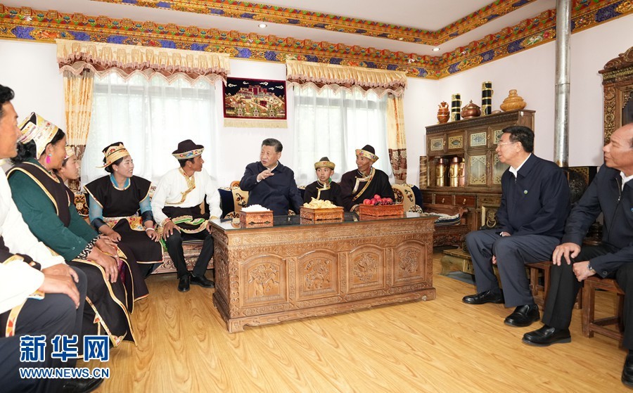 7月21日至23日,中共中央总书记、国家主席、中央军委主席习近平来到西藏,祝贺西藏和平解放70周年,看望慰问西藏各族干部群众。这是21日下午,习近平在林芝市巴宜区林芝镇嘎拉村,同村民达瓦坚参一家人围坐在客厅里聊家常。新华社记者 李学仁 摄