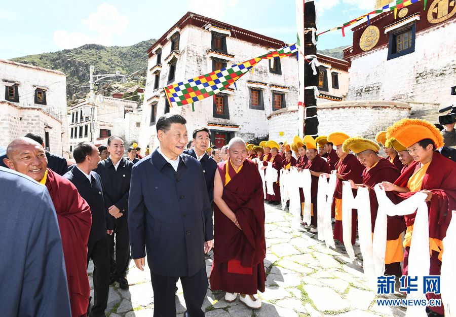 7月21日至23日,中共中央总书记、国家主席、中央军委主席习近平来到西藏,祝贺西藏和平解放70周年,看望慰问西藏各族干部群众。这是22日下午,习近平在位于拉萨西郊的哲蚌寺考察。新华社记者 谢环驰 摄