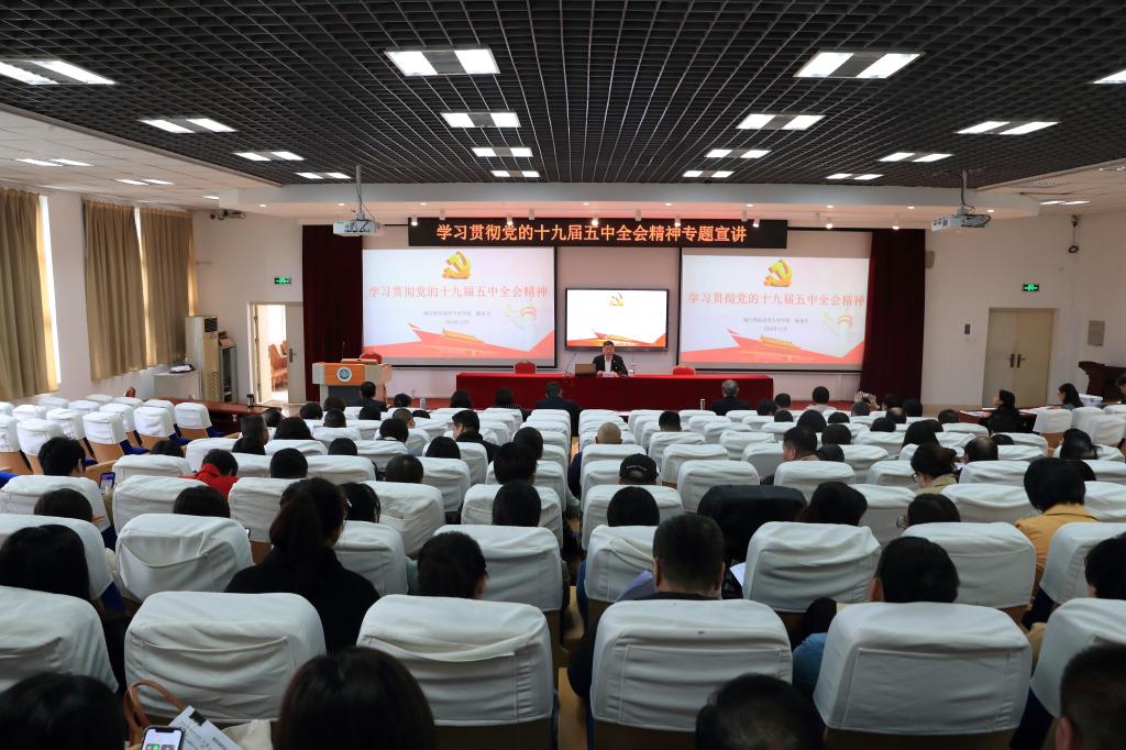 陈荣生书记在宣讲中紧扣习近平总书记在党的十九届五中全会上的重要讲话和全会审议通过的规划《建议》,从深刻认识新发展阶段、牢牢把握构建新发展格局等五个方面,从历史和现实、理论和实践、系统和辩证的角度,生动宣讲了党的十九届五中全会精神,深刻阐释了习近平总书记在全会上提出的一系列新思想新观点新论断新要求,并结合学校实际,就学校学习宣传贯彻党的十九届五中全会精神工作提出明确要求。