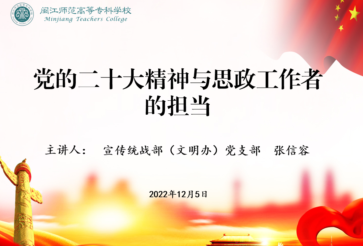 上好一堂专题党课。12月5日,宣传统战部(文明办党)支部和马克思主义学院党总支以党支部书记交叉上党课的方式,为全体党员作了一堂题为《党的二十大精神与思政工作者的担当》的专题党课,从党的二十大精神中汲取奋进力量,更加自觉深刻学习领会党的二十大精神。党员们纷纷表示,作为思政教育工作者和青年工作者,将深入学习领会跟“青年”和“教学”相关的内容,学先一步、学深一层,为准确宣讲党的二十大精神储备和积蓄新的力量。