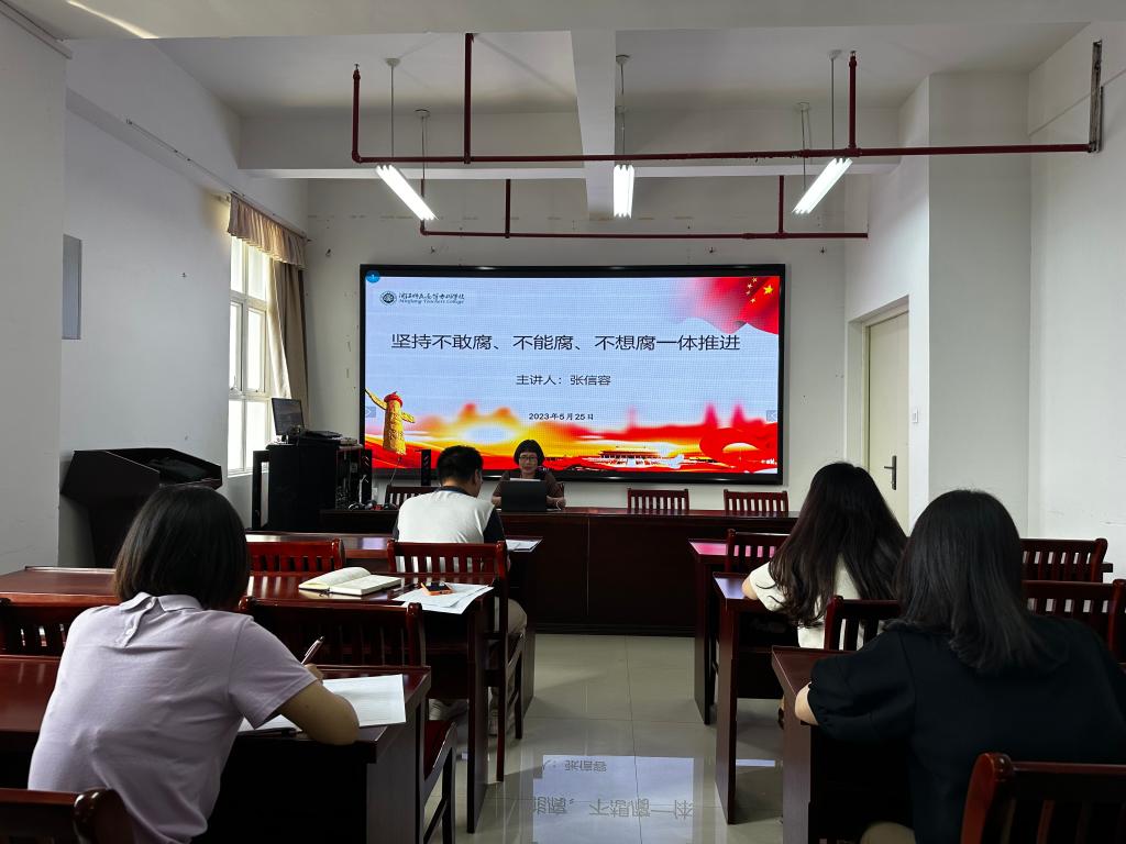 会上,支部书记张信容讲授了《坚持不敢腐、不能腐、不想腐一体推进》专题党课。她围绕“反腐败是最彻底的自我革命”“成功走出一条中国特色反腐败之路”“坚决打赢反腐败攻坚战、持久战”三个部分,全面介绍了党的十八大以来,党中央推进反腐败斗争提出的一系列新理念新思想新战略,带领全体党员深刻理解领会反腐败斗争取得的显著成效、积累的重要经验,深刻理解领会一体推进不敢腐、不能腐、不想腐的重点工作,不断增强全面打赢反腐败斗争攻坚战、持久战的政治自觉。