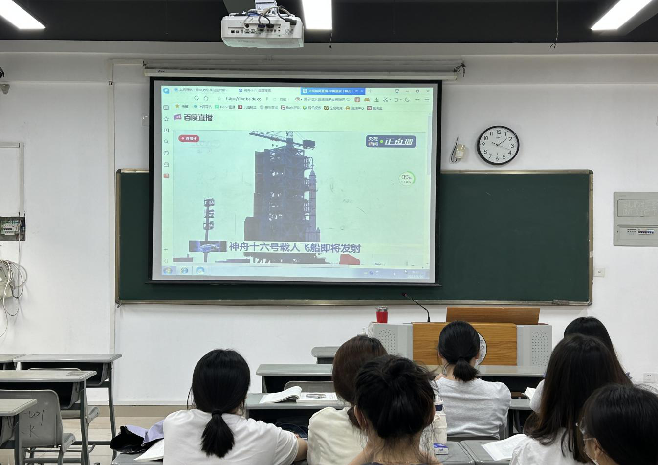 北京时间9时31分,搭载神舟十六号载人飞船的长征二号F遥十六运载火箭在酒泉卫星发射中心发射升空,景海鹏、朱杨柱、桂海潮等3名航天员领命出征。直播过程中,同学们紧盯着屏幕,共同倒计时,生怕错过这一激动人心的时刻。发射成功的那一刻,同学们热血沸腾,掌声不断。从神舟五号到神舟十六号,中国航天人奔赴星辰大海的步伐从未停止,展现了伟大的中国力量、中国精神、中国效率。