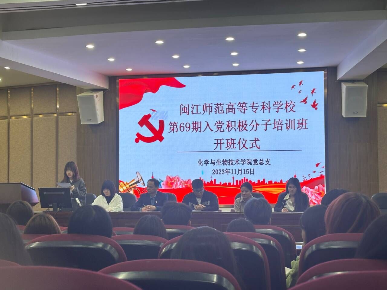 根据闽江师范高等专科学校党校学习工作安排,由化学与生物技术学院党总支承办的第69期入党积极分子培训班于2023年11月15日在仓山校区学术报告厅顺利开班。学院党总支书记王华、学生支部书记赖翠凤、辅导员、入党积极分子和23级学生代表约90人参加开班仪式。