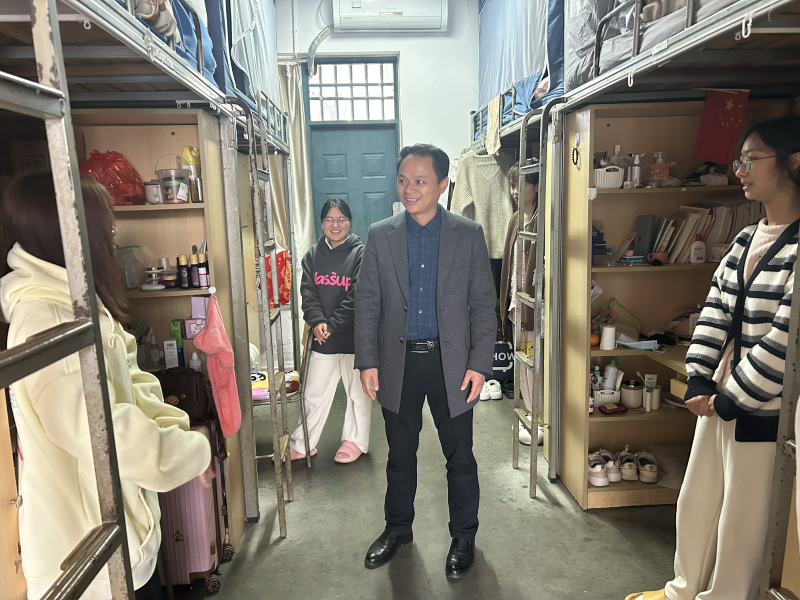 2024年3月6日,化学与生物技术学院党总支书记王华到福清校区学生宿舍开展安全检查,了解学生开学返校的学习和生活情况,并对学生宿舍安全做出细致地指导。
