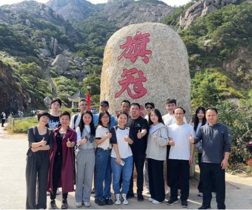 经过一个半小时的车程,老师们抵达第一站——旗冠顶。旗冠顶位于奇达村白云山之巅,海风虽劲,脚步更劲,大家经过1889层台阶的攀爬,登上誉有福建“里约热内卢”之称的旗冠顶。在旗冠顶主峰上,从险峻的石崖远眺,岩石之下依海而建的奇达渔村尽收眼底,大海波澜壮阔,风机展翅转动,渔村古韵奇趣,让人印象深刻。