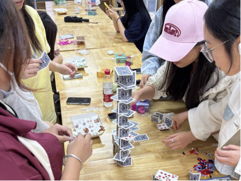 “纸间花语,焕心之美”心理创作活动。活动过程充满了创意与温情。“语绘奇镜”环节,团队成员凭借奇思妙想编织出精彩纷呈的奇妙故事,不仅考验大家的创造力,更能促进团队成员间的默契与协作;在“纸牌筑梦”环节中,参与者在轻松有趣的氛围里,增进彼此间的信任与理解,共同筑起属于团队的“心灵之塔”;在具有创造性的“纸板魔法”环节,同学们运用纸板、画笔等材料,充分发挥想象力和创造力,制作出各种精美的手工作品,每一件作品都蕴含着同学们对美好生活的向往和对心理健康的追求。