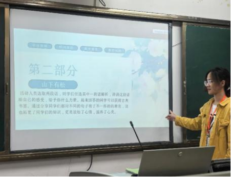 “品书香之韵,绘心灵之花”心理健康活动。活动现场陈列着各类心理学经典著作,同学们踊跃参与,沉浸在书的世界里。大家围坐在一起,分享自己在阅读过程中的感悟与体会。有的同学分享从书中习得的情绪管理方法,有的同学畅谈通过阅读实现的自我认知图片。在“飞花令”、“山下有松”、“绿醒青木”游戏环节中同学们积极互动,不仅拓宽了心理学知识视野,更在书香的浸润下滋养了心灵,为心理健康注入了强大的精神力量。