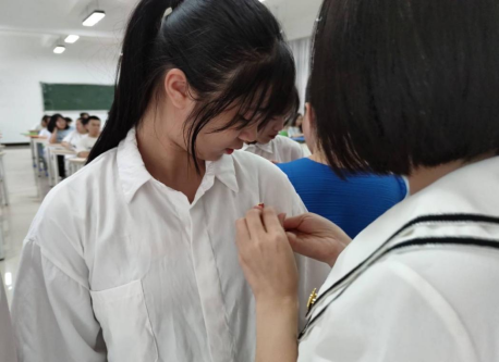 《国际歌》歌声响起,入党宣誓仪式正式开始。党总支书记陈宗保同志首先致辞,他对参加宣誓的预备党员们寄予殷切希望:要履行党员的权利和义务,要团结带领同学积极向党组织靠拢,传播党组织的先进思想,要保持积极向上担当精神。随后,学生党支部书记赖翠凤同志带领预备党员们面向党旗,庄严宣誓:“我志愿加入中国共产党……随时准备为党和人民牺牲一切,永不叛党。”宣誓后,老党员为预备党员们佩戴党员徽章。这不仅是精神的传承,更是精神的延续,小小党员徽章承担着大大的责任。老党员代表张瑛同志同时提出寄语:“入党是光荣的,戴上党员徽章就要有争优创先意识、参与意识、成长意识,要时刻发挥党员的引领作用。”在党的百年华诞来临之际,在中国共产党党旗下庄严宣誓,让所有新党员心潮澎湃、激动不已。左学智同学代表新党员表示,入党是一次新生,将牢牢恪守在党旗下的誓言,与党同心同德、与时代发展同向同行,奋发有为。