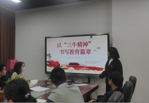 化学与生物工程系学生党支部于2021年11月10日13:10在4-106会议室开展以“‘三牛精神’书写教育篇章’”为主题的微党课。党课由学生党支部书记赖翠凤同志主讲,化学与生物工程系教师党支部全体成员共同参与。