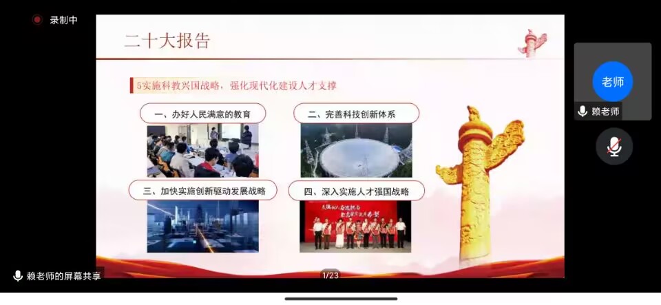 首先,赖老师阐明了学习贯彻党的二十大精神的重要意义,要坚定“四个自信”,推进党的自我革命,为全面建设社会主义现代化国家、全面推进中华民族伟大复兴指明前进方向。接着,她解读了党的二十大报告中的新观点、新论断、新思想,帮助学生全面准确学习领会党的二十大精神。她带领学生一同学习、讨论了习近平总书记在党的二十大报告中提出的“有理想、敢担当、能吃苦、肯奋斗”的新时代好青年标准,激励青年学生牢记习近平总书记嘱托,筑牢精神之基,厚植爱国情怀,不负时代,不负韶华,不负党和人民的殷切期望。