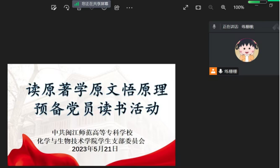 为引导学院预备党员在阅读中深刻感悟党的创新理论的思想伟力,形成爱读书、读好书、善读书的浓厚氛围,化学与生物技术学院学生党支部于2023年5月21日19:30在线上腾讯会议开展预备党员读书会,主要探讨《习近平在福州》一书。