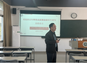 11月19日,洪书源院长以“用党的百年辉煌成就激励青年自信自立”为主题,组织同学们学习“改革先锋”勋章获得者的先进事迹,让同学们认识到要以加强党的基本理论学习为重点,深入学习爱党爱国教育。接着,他围绕1921年--2021年党的百年历程中的四大重要节点对党的光辉历史进行详细介绍,并畅谈在中国共产党的带领下取得的伟大成就,以此鼓励学生坚定理想信念,厚植爱国情怀,争做一名自信自立的新时代好青年。