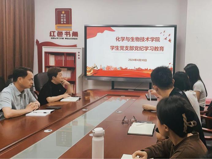 为提高学生支部党员的党纪素养,加强对党纪党规的学习和理解,推动党员在日常生活中更好地践行党的纪律和要求,2024年4月30日,化学与生物技术学院学生党支部在党员活动室开展党纪学习教育。