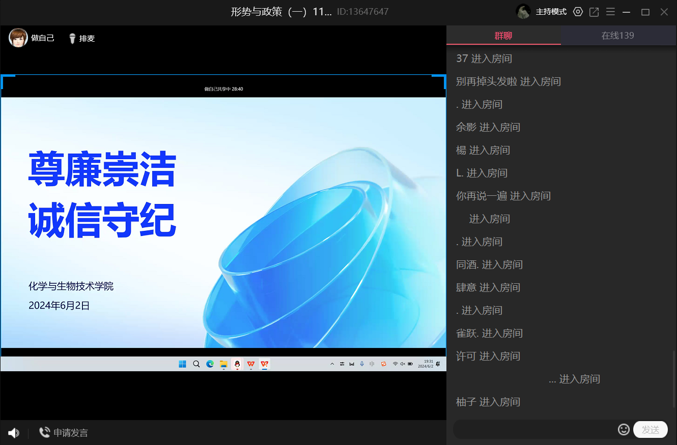 为加强毕业班学生敬廉崇洁的观念,引导毕业生廉洁修身、廉洁从业,系好走向社会的“第一粒扣子”,化学与生物技术学院于2024年6月2日在线上开展“崇廉尚洁,诚信守纪”主题班会。