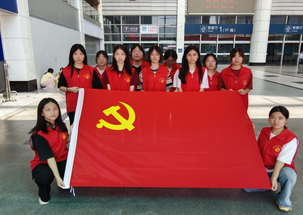 入党积极分子身着整齐的志愿者服装,面带微笑地为过往路人提供各项帮助。每一位路人的询问都能得到他们耐心细致的解答;遇到拖着大件行李行动不便的乘客,他们主动上前帮忙搬运行李,引导其乘坐无障碍电梯;当有老人和小孩需要帮助时,他们小心搀扶,确保他们安全通过闸机和上下楼梯;在换乘通道的交汇处,志愿者们详细地为乘客讲解换乘路线,避免乘客因走错方向而耽误行程......他们忙碌的身影穿梭在人群中,为这个繁忙的交通枢纽增添了一抹温暖的色彩。