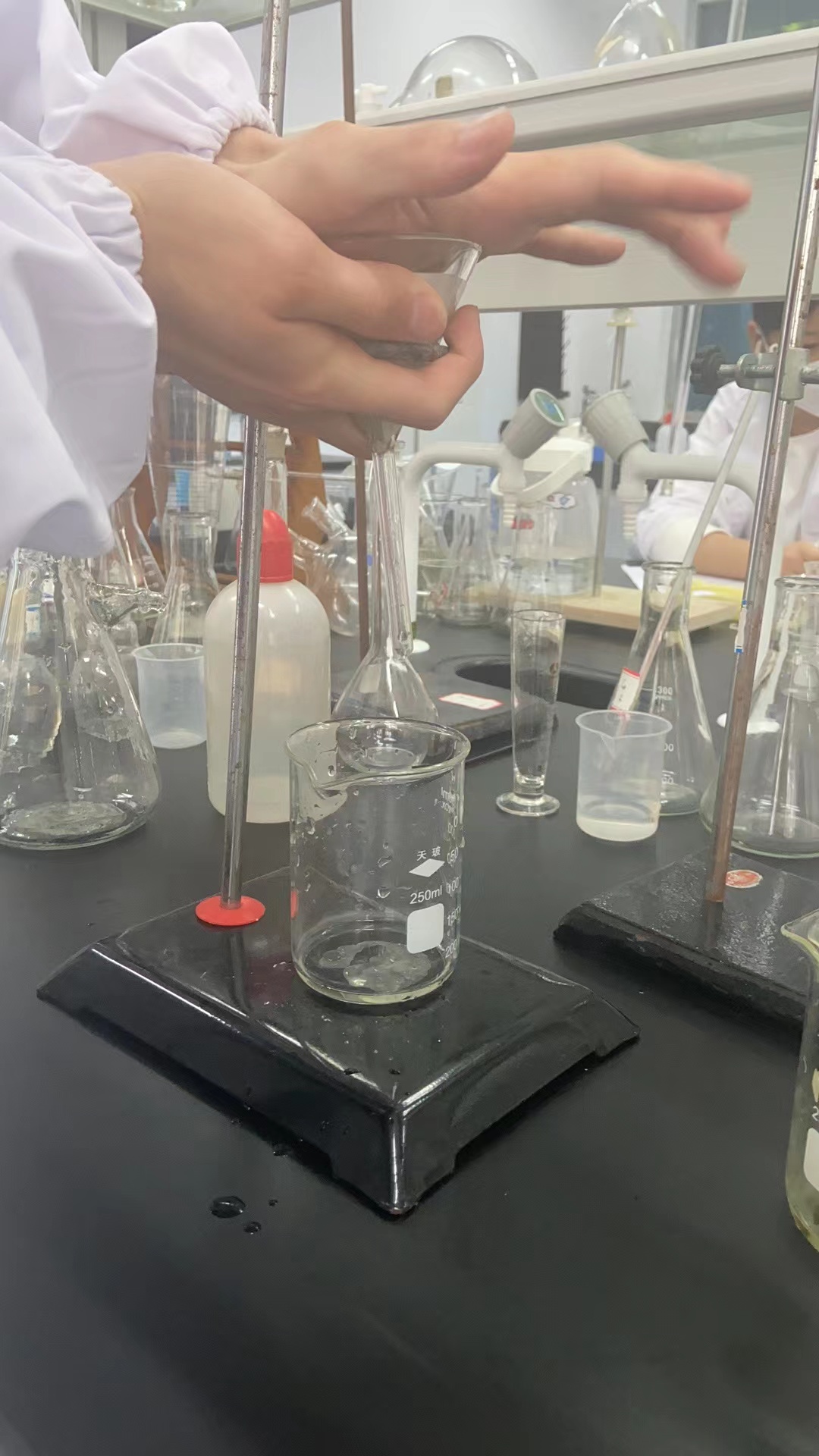 本次实训内容为《甘露醇的制备与鉴别》,同学们先从海带中提取甘露醇、并对甘露醇进行浓缩、提纯,然后用高碘酸钠法测定甘露醇含量。实训过程中,李丽婷老师引导同学积极思考,从实验技能提升到专业素养养成,最终形成对海带中甘露醇提纯和检测产业链的思考。