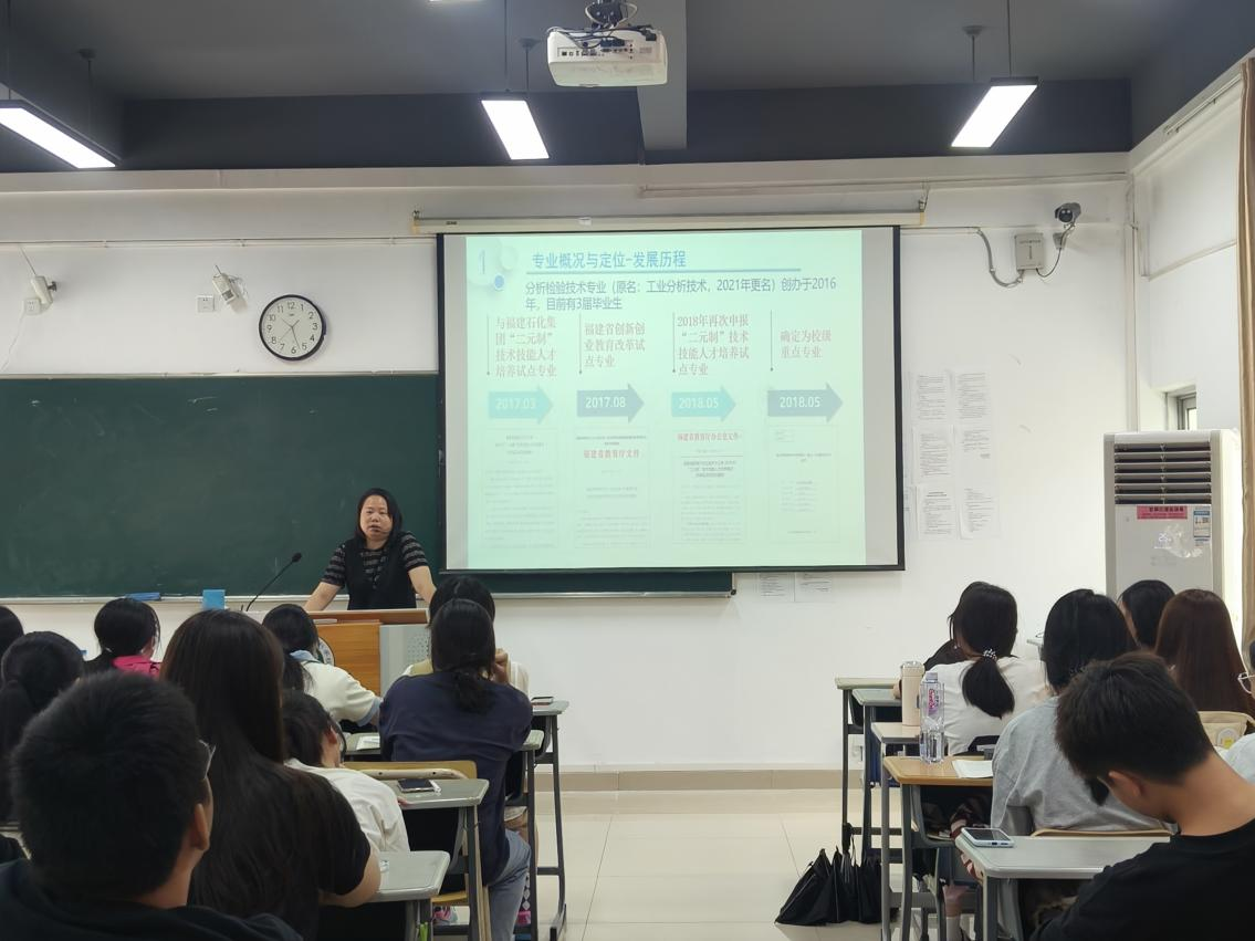 林珍红老师在福清校区为24分析检验技术专业新生介绍了专业概况与定位、师资队伍、教学资源,以及学院荣誉等,帮助新生全面了解专业内容,激励同学们积极参加学院专业活动,充实大学生活,为未来职业工作打下夯实基础。