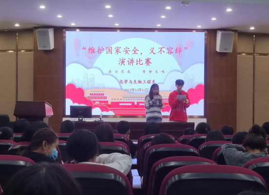 时代在发展,科技在进步,形势在变化,我们有责任、有义务维持和保护国家、社会的平安和安稳。为了树立同学们维护国家安全的意识,增强社会责任感,化学与生物工程系于2021年11月21日在学术报告厅开展了“维护国家安全,义不容辞”演讲比赛。