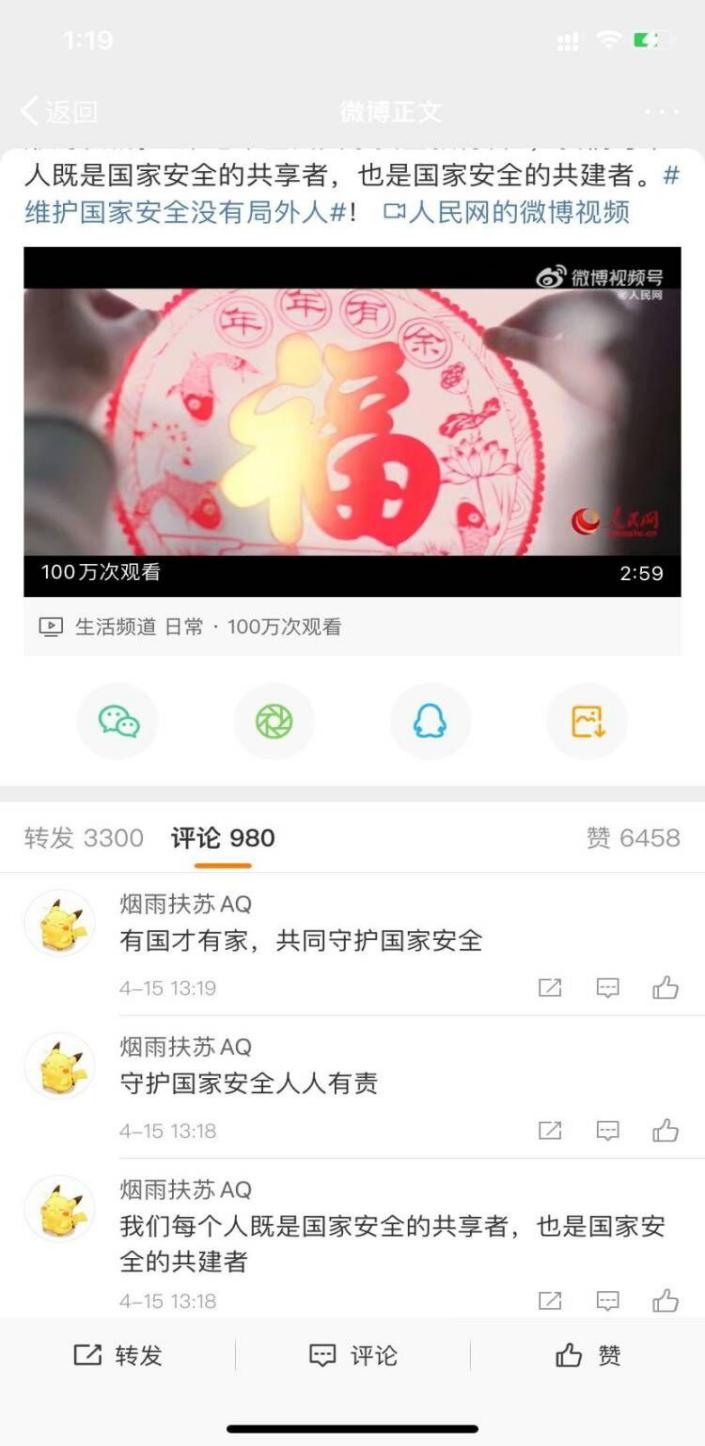 为切实增强广大师生国家安全意识,普及和了解国家安全知识,自觉履行维护国家安全,保守国家秘密义务,化学与生物技术学院于2022年4月15日参与参与线上“微博#国家安全日#话题”互动活动。