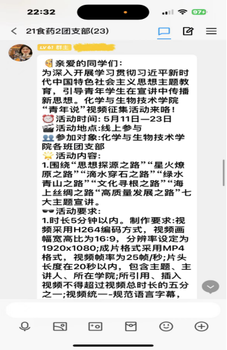 围绕深入开展学习贯彻习近平新时代中国特色社会主义思想主题教育,为引导青年学生学思想、重实践、见行动,化学与生物技术学院于2023年5月11日-23日开展了“青年说”视频征集活动。
