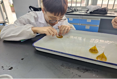 选手们分工协作,配合默契,收集校园的落叶进行精心制作:从氢氧化钠溶液的调配——碱液中沸腾——将叶片加工网状脉——双氧水溶液漂白——标本纸中压展——荧光笔给叶脉上色、晾干、压膜——创意DIY。一份份原创的叶脉书签惊喜展现。