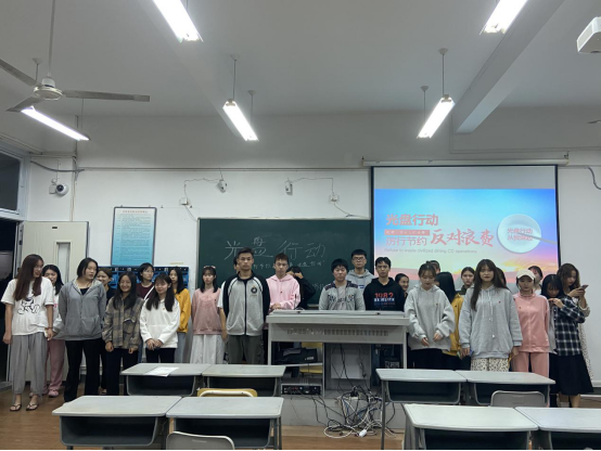 活动在团歌的演唱中拉开序幕,陈同学先是向同学们介绍了什么是光盘行动,实行光盘行动的意义,还在活动中开展了“光盘行动”知识竞赛,同学们都积极响应,踊跃回答。