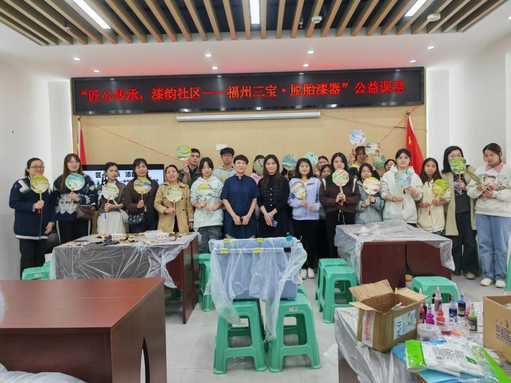 为了拓展大学生非遗文化知识,更好的宣传非遗文化,2024年11月22日,化学与生物技术学院组织15位志愿者前往福州市鼓楼区天元社区协助开展“匠心传承,漆韵社区——福州三宝,脱胎漆器”公益活动。
