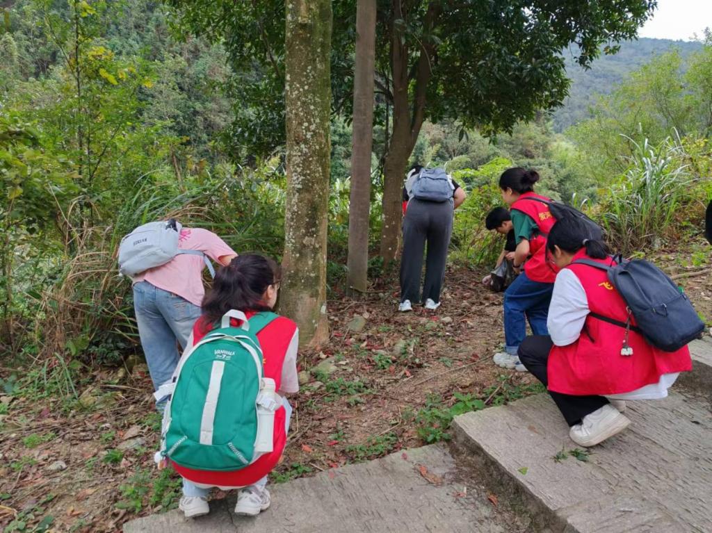 活动开始前,领队同学带领志愿者们做登山前的热身运动。活动期间,志愿者们积极认真,不畏辛苦,不论是山路、草丛、灌木里的垃圾都一一捡入垃圾袋,他们走过之地都变得格外干净。遇见问路的登山客他们细心指引,对乱丢垃圾的人们予以劝诫,宣传“绿水青山就是金山银山”的生态环境保护意识。在路滑地段,志愿者们相互搀扶,相互提醒注意安全。一路上,登山的旅客们对志愿者们纷纷赞扬,感谢他们为状元岭环境做的贡献。