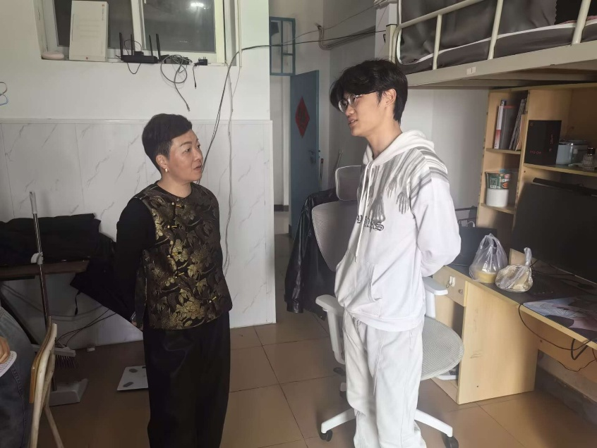 走访中,张瑛带领辅导员与同学们亲切交谈,详细询问了他们的学习、生活情况,以及遇到的困难和问题。她叮嘱同学们要合理安排时间,认真学习,积极参加校园文化活动,度过充实而有意义的大学生活。同时,她还特别强调了宿舍安全用电、防火防盗等注意事项,提醒同学们要提高安全意识,共同维护宿舍安全。