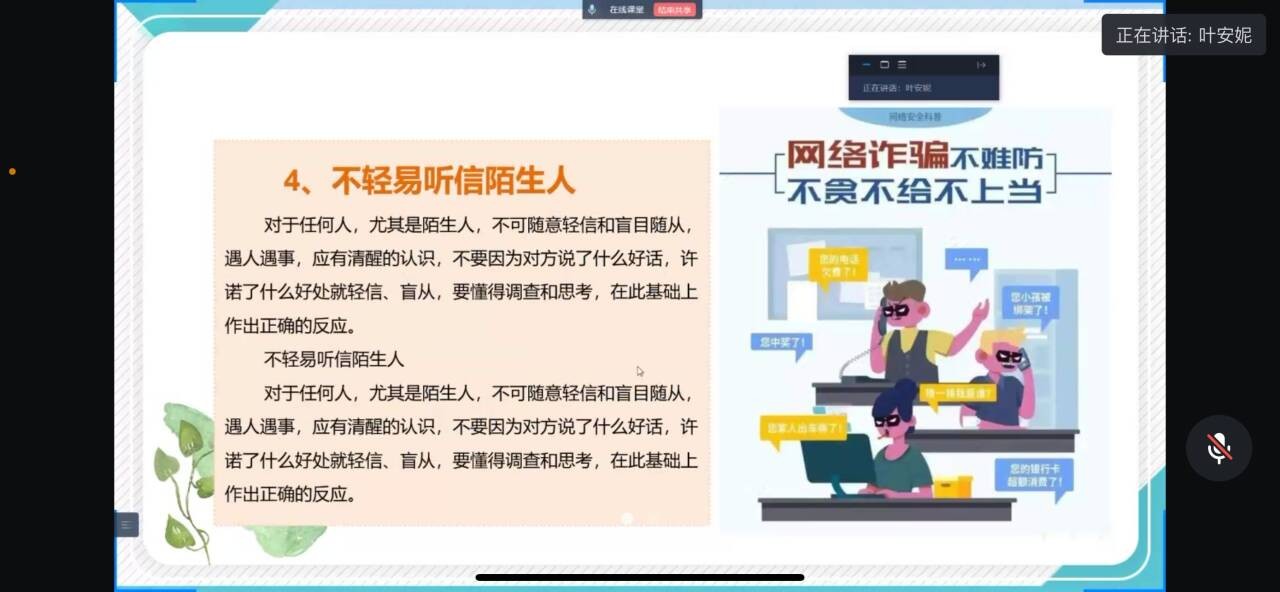 其次,辅导员系统讲解个人信息保护、安全密码设置、可疑链接辨识、规范网络言论等实用知识与技能,并着重强调“未知链接不点击、陌生来电不轻信、个人信息不透露、转账汇款多核实”等四个网络安全基本原则。