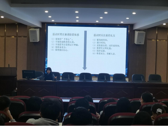 辅导员赖老师针对面试的四个阶段(准备阶段、引入阶段、正确阶段、结束阶段)一一详细讲解。她还强调18级同学们即将参加顶岗实习,面试时要消除紧张感,保持平常心,要准备充分,要增强自信心;同时注意面试技巧、礼仪、程序,希望同学们能够在面试中脱颖而出。