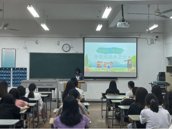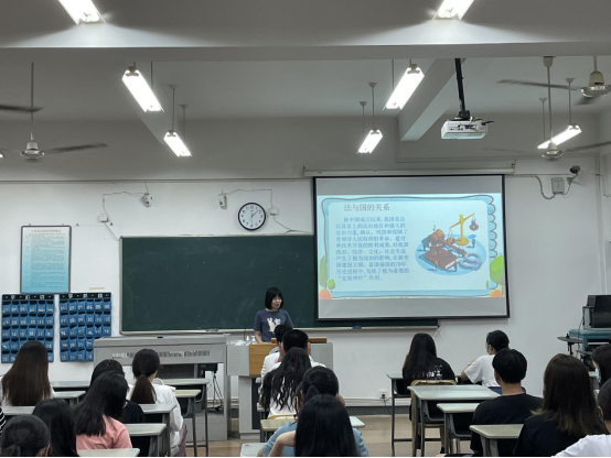 主讲人赖老师先向同学们讲述了宪法的重要性和作用,以及我国宪法的发展历程,接着介绍了以宪法为基础的法律法规,并阐述了法与国的关系所在,以及我国70年来宪法发展的宝贵经验。最后,赖老师讲解了我们为什么要遵守法律,以及我们应该如何做到遵纪守法,并进行了宪法小知识问答,引起了同学们的热烈反映。