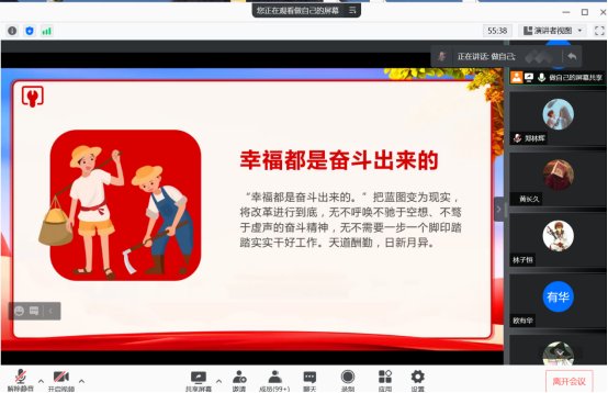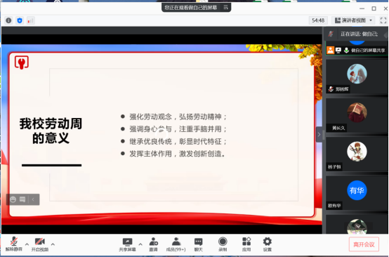 本次班会,进一步贯彻学习了习近平总书记在全国教育大会上的讲话精神,传达了“以劳动为荣”的思想,让同学们进一步了解“爱劳动,爱生活”的重要性,激励同学们热爱劳动,艰苦奋斗,成为德智体美劳全面发展的社会主义建设者和接班人。