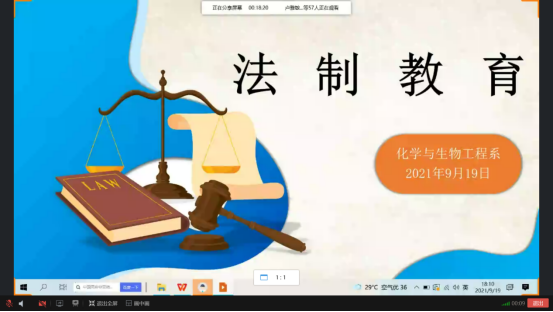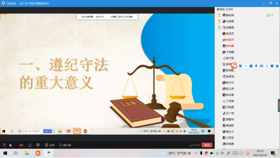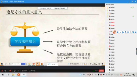 为进一步引导同学们树立社会主义法制观念,养成遵纪守法的行为习惯,培养同学们成为合格公民。2021年9月19日,19级生物制药技术班于线上开展了以“法制教育”主题班会。
