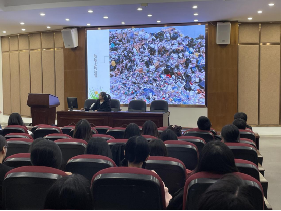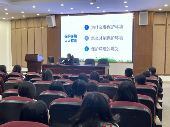 魏同学开场即指出保护生态环境的重要性,地球是人类赖以生存的唯一家园。只有保护环境,保护地球,才能保护人类自己,才能使人类的文明发展得更远,让人类的生活环境更舒适。她还展示了目前生态环境的现状,通过一则公益广告让同学们加深对保护生态环境的理解,鼓励同学们用行动践行生态保护。比如:提倡步行或乘坐公共汽车;使用布袋或纸袋替代超市、商场等提供的塑料袋;拒绝使用一次性用品;节约用水,随手关水龙头等。