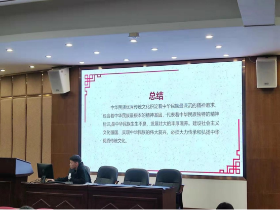 郑同学首先向大家介绍了中华优秀传统文化的定义,提到中华优秀传统文化是我们民族的“根”和“魂”。他还引出问题“中华优秀传统文化知多少?”,了解学生对中国传统文化的认知。进而深入分析“为什么要弘扬中华传统文化”,中国传统文化有助于形成和丰富中华民族精神,推动中国社会发展进步。最后,他结合当下大学生的实际,重点阐述了传承和弘扬中华优秀传统文化的途径,加强爱国主义教育和社会主义教育,让同学们树立起传播优秀传统文化与美德的观念,增强做中国人的骨气和底气。