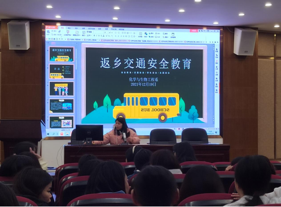 为了增强同学们返乡交通安全意识,提高自我保护能力,加强防疫措施,打造平安校园,2021年12月19日,化学与生物工程系在学术报告厅开展了“返乡交通安全教育”主题班会。
