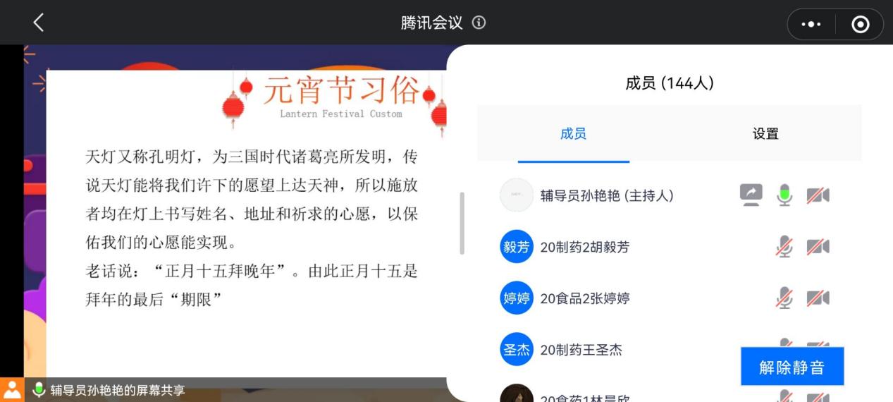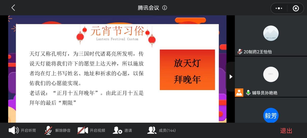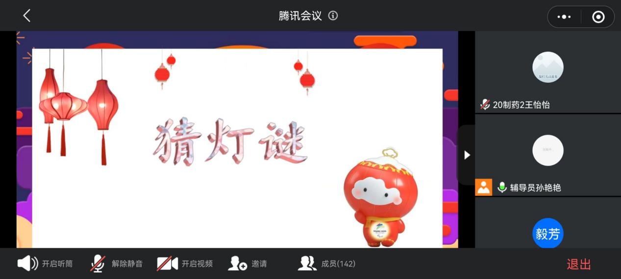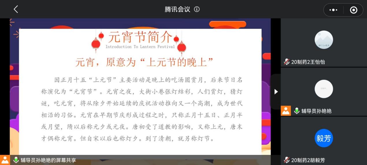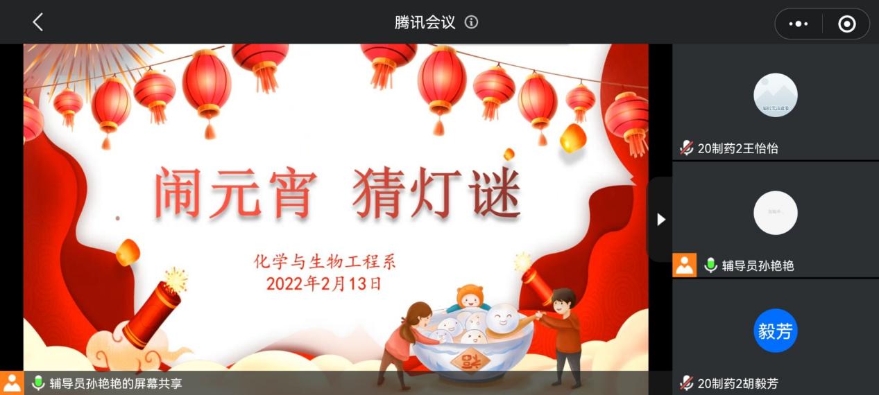 为更好地传承和弘扬中华民族传统文化,让同学们品味佳节的同时深刻传统节日对于中华民族的意义,化学与生物技术学院于2022年2月13日16:00在线上开展了一场以“闹元宵,猜灯谜”为主题的特色班会。本次活动由辅导员孙老师组织,20级制药、食药共四个班级参与。
