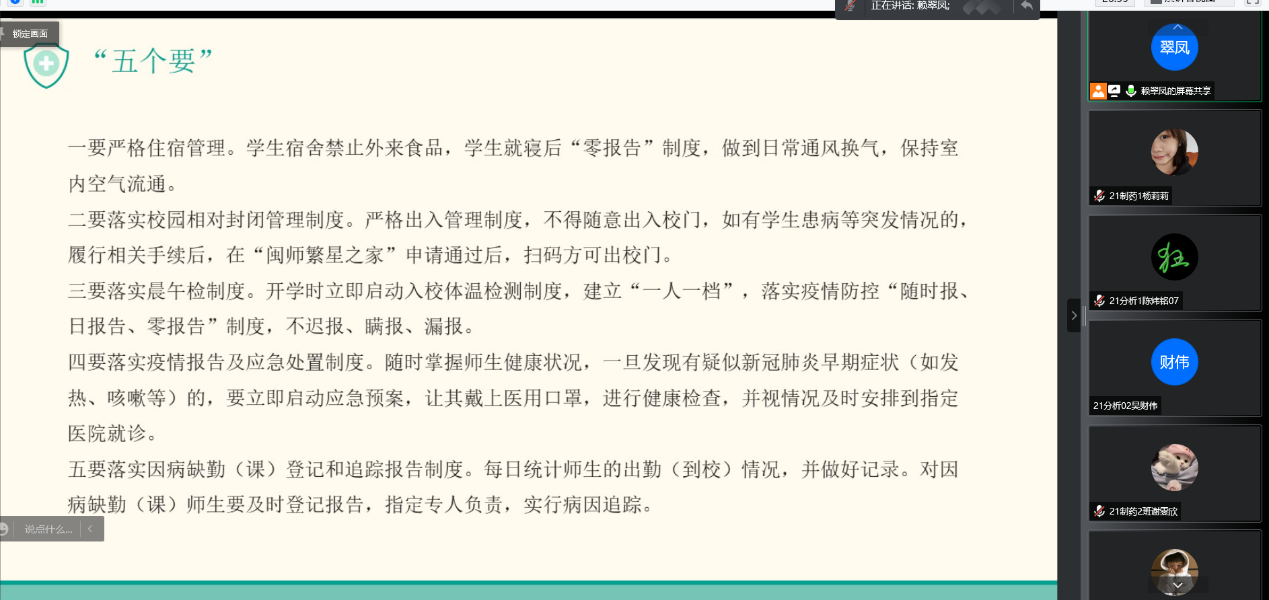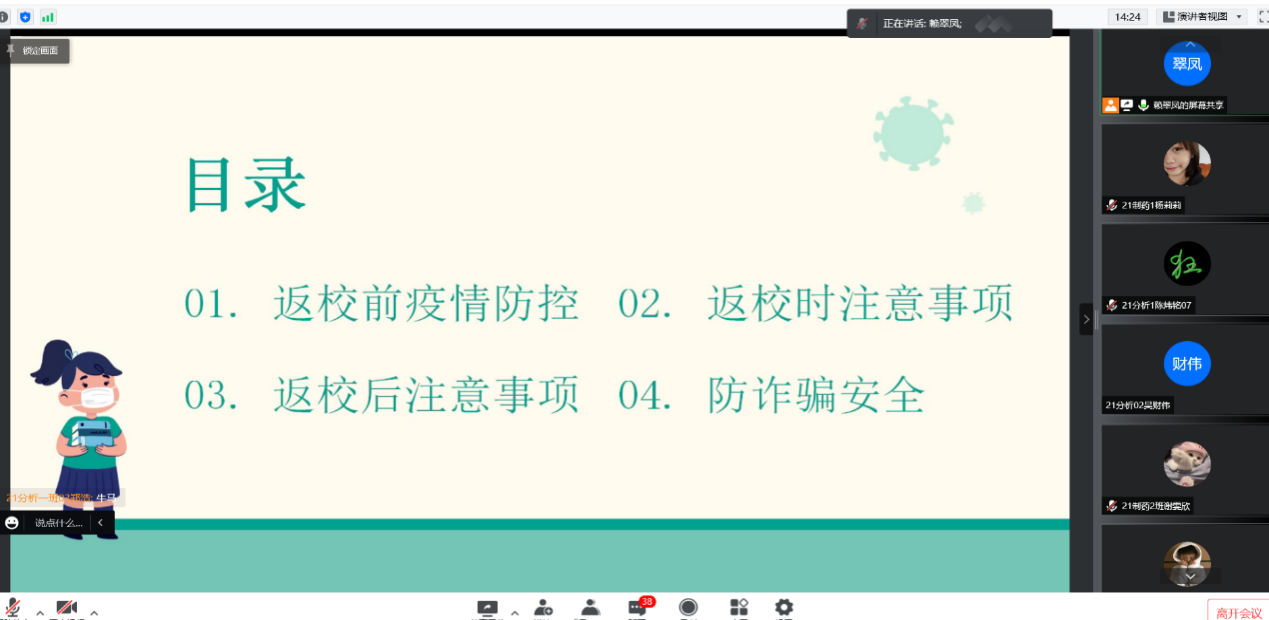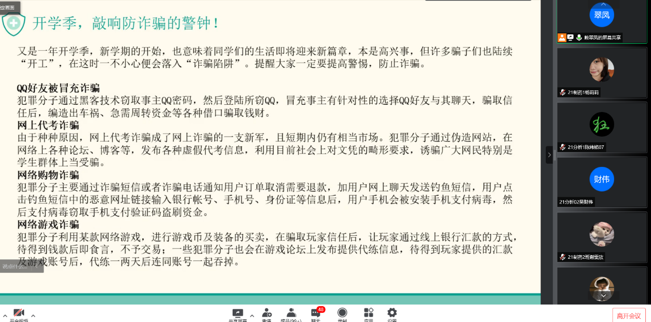 辅导员赖老师从四个方面展开,涉及返校前、返校中、返校后疫情防控要求和防诈骗安全知识。第一,在返校前要加强健康管理,建立健康档案,做到一人一档;坚持每日健康监测,不前往中高风险地区,做到不瞒报、漏报、谎报、错报;备足衣物和医疗用品。第二,重点讲述了返校时的安全注意事项,让同学们了解疫情防控期间返校的流程及批准返校的条件,返校途中加强防护,注意个人卫生,与他人保持1米以上距离。第三,返校后要严格遵守“五要”制度:要严禁宿舍管理、要落实校园相对封闭式管理、要落实晨午检制度、要落实疫情报告及应急处置制度、要落实因病缺勤(课)登记和追踪报告制度,告诫同学们疫情尚未结束,防护请勿松懈。最后,提醒同学们在开学季要提高警惕,预防诈骗。希望大家能够保护好个人信息、不轻信他人、预防被骗,让这些骗子无法“开工”。