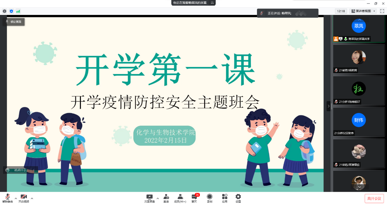 为了加强开学疫情防控工作,提高应对新冠肺炎疫情的意识和能力,确保学生顺利返校,保证良好的校园环境,化学与生物技术学院于2022年2月15日在开展“开学疫情防控安全”线上主题班会。