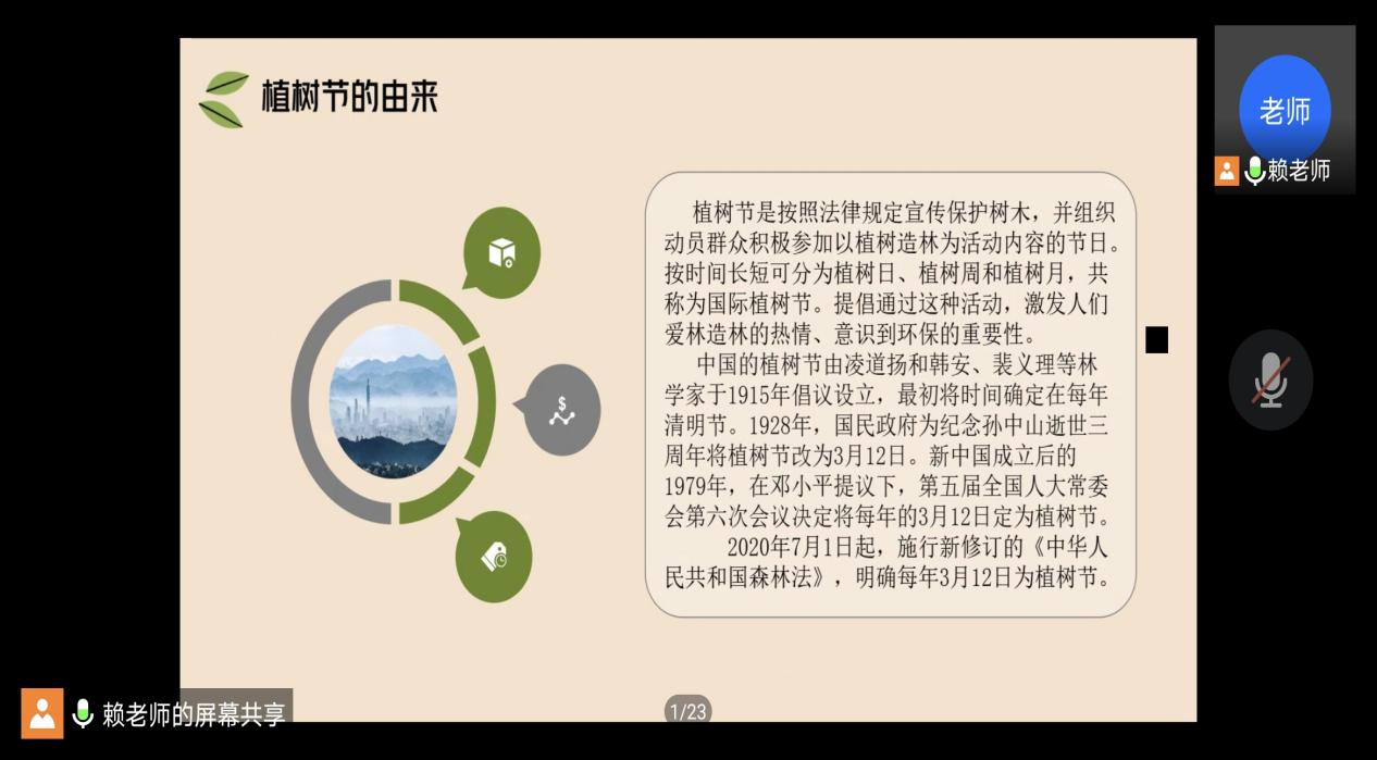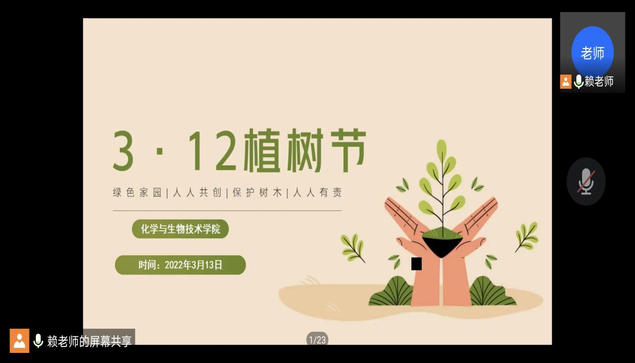 为了增强同学们爱护植物、保护生态环境的意识,热爱大自然,关注绿化、环境的问题,化学与生物技术学院于2022年3月13日在线上开展了“3.12植树节”主题班会。
