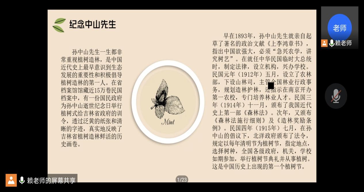“十年树木,百年树人”。春季正是植树造林的季节,不仅美化环境,还提高空气质量,改善植被生态环境。赖老师首先提到了3·12植树节的由来和意义。植树节是由凌道扬、韩安等林学家在1915年倡议设立的,原是定在每年清明节,后为了纪念孙中山先生而改为3月12日。孙中山先生非常重视植树造林,是最早意识到生态发展的重要性和积极倡导植树造林的第一人。作为大学生,要积极弘扬和传承植树精神,宣传植树节的知识,重视绿化环境。