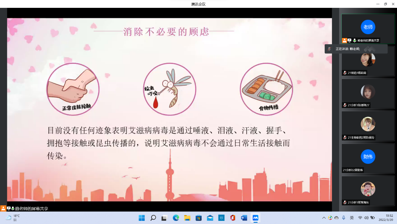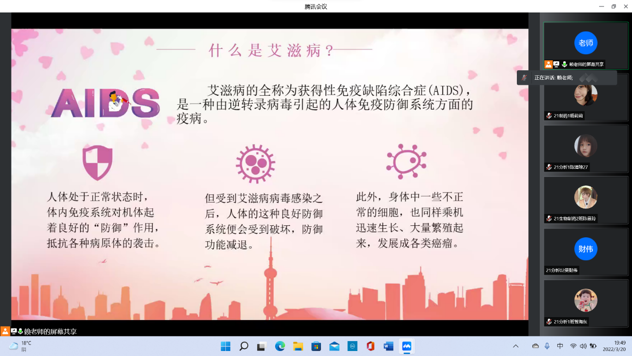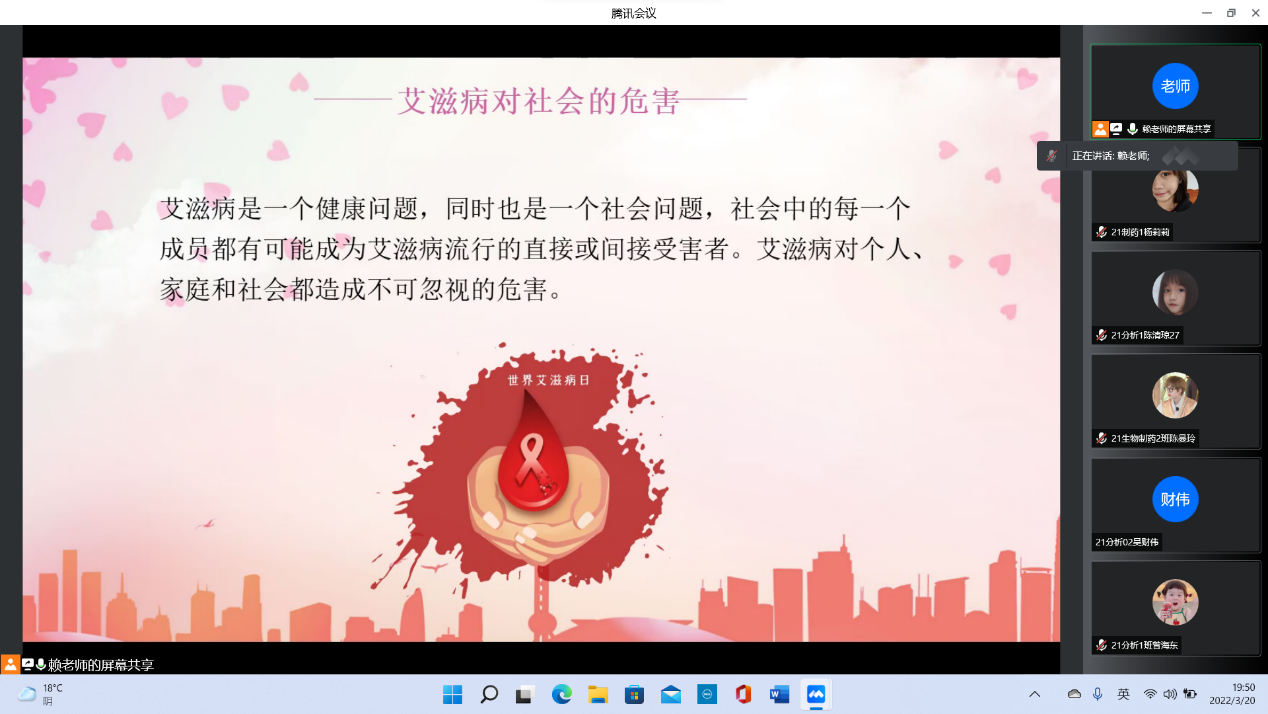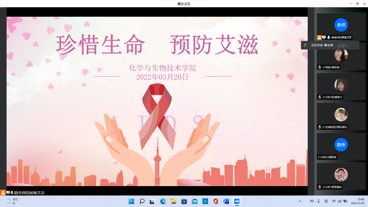 为了使同学们了解艾滋病的相关知识,加强同学们对艾滋病的自身防护以及关爱、扶助艾滋病人的责任感,营造青年学生积极参与预防艾滋病的良好氛围,化学与生物技术学院于2022年3月20日在线上开展了“珍惜生命,预防艾滋”主题班会。
