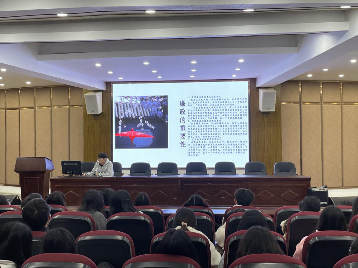 蔡同学首先介绍了“廉政”一词,办事公正廉洁,不以权谋私。接着,他以廉政榜样——张富清的先进事迹感染着每一位学生,60多年深藏功名,他用自己的朴实纯粹、淡泊名利,书写了自己精彩的人生。最后,他倡导大学生要遵守规章制度,提高认识,加强学习,接受监督,做到廉洁从学,反腐倡廉。